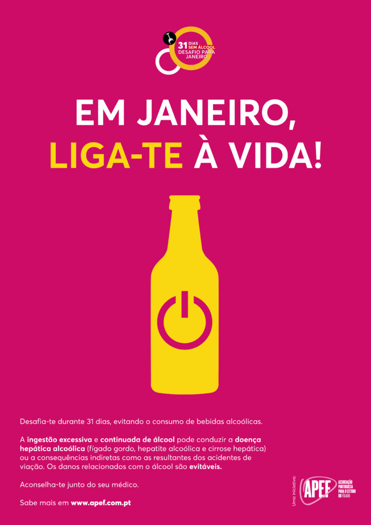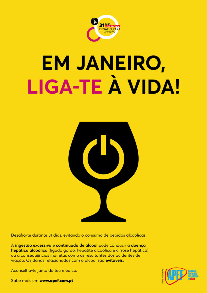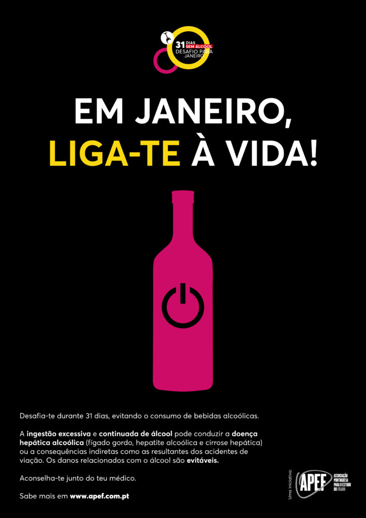 A Associação Portuguesa para o Estudo do Fígado (APEF) volta a consciencializar para a doença hepática alcoólica, uma consequência que advém do elevado consumo de álcool. Sob o mote “Em janeiro, liga-te à vida!”, a ação nacional de consciencialização surge no âmbito do desafio “Janeiro Sem Álcool”, e decorrerá no primeiro mês de 2024, nas redes sociais da associação, com o objetivo de alertar os jovens para os danos relacionados com o álcool.